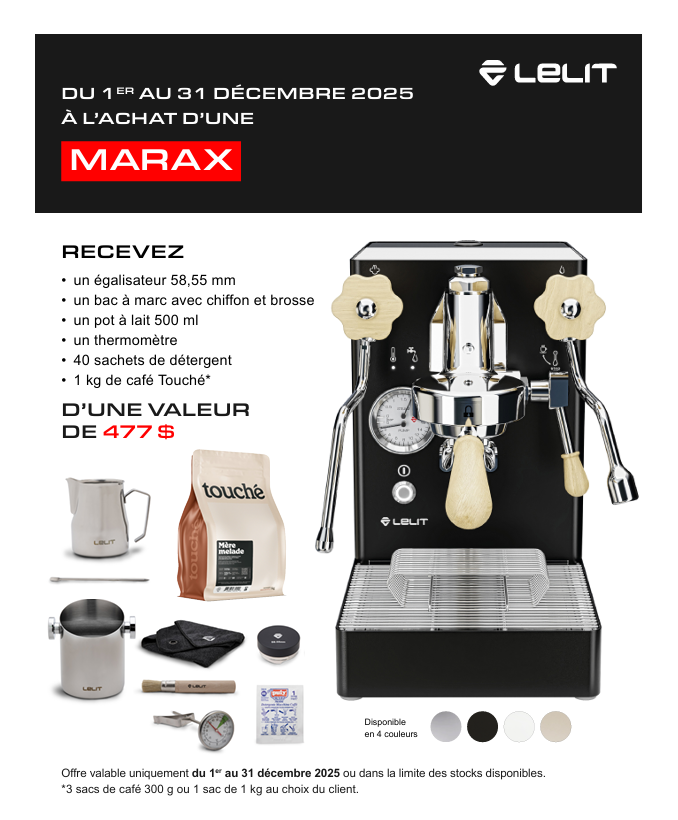 MaraX is delivered with a LELIT58 filter holder with inclined handle and “coffee-slide” coffee outlets, a LELIT58 filter for 9 to 11g, a LELIT58 filter for 14 to 18g, a LELIT58 filter for 18 to 21g, a LELIT58 blind filter , a booster for espresso cups, a 35L water filter, a drip tray with self-cleaning grid, a LELIT58 stainless steel tamper with red wooden handle, a small brush for cleaning the group and the kit for the first cleaning of the machine.