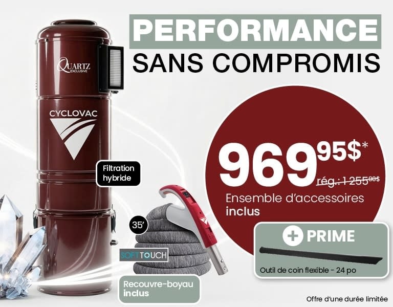 Aspirateur central CycloVac Quartz Exclusive + Ensemble d'accessoires de luxe avec boyau de 35 pieds